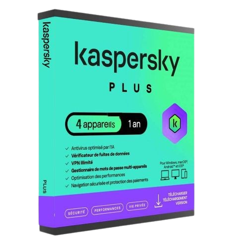 Kaspersky Plus est une solution de sécurité nouvelle génération, conçue pour protéger jusqu’à 4 appareils pendant 1 an (PC Windows, Mac, Android, iOS). Grâce à son antivirus optimisé par l’IA, il bloque en temps réel virus, ransomware, spywares et menaces zero‑day sans ralentir vos performances. Cette édition intègre également un VPN illimité pour chiffrer votre connexion et préserver votre anonymat en ligne, ainsi qu’un gestionnaire de mots de passe multi‑appareils pour sécuriser vos accès. Idéal pour les particuliers exigeants, Kaspersky Plus combine puissance, fiabilité et simplicité d’utilisation.